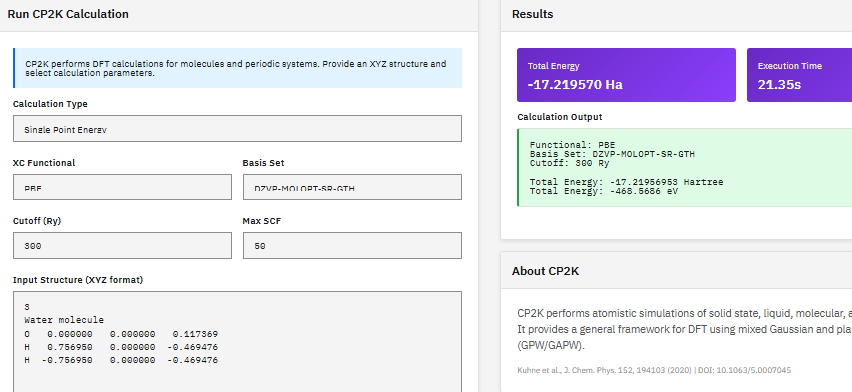 A quantum chemistry and solid-state physics package combining DFT with Gaussian and plane-wave (GPW/GAPW) methods, enabling geometry optimization, cell optimization, and ab initio molecular dynamics for both periodic crystals and isolated molecular systems.
