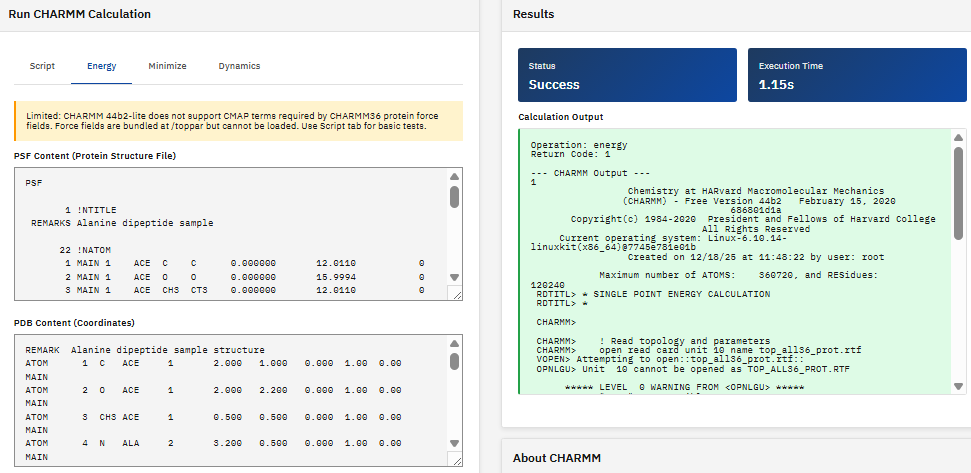 A molecular simulation program (Chemistry at HARvard Macromolecular Mechanics) for modeling macromolecular systems, providing energy calculations, minimization, dynamics simulations, and sampling methods for proteins, nucleic acids, lipids, and small molecules.