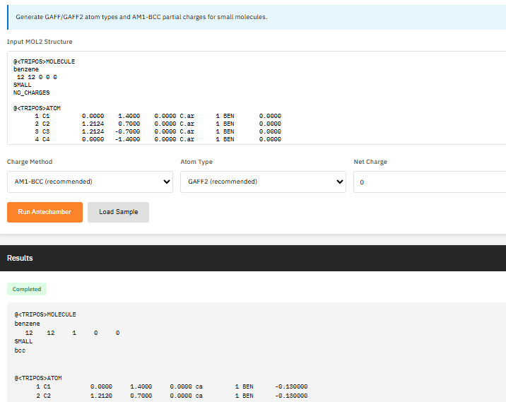A force field parameterization and molecular dynamics preparation suite providing antechamber for GAFF/GAFF2 atom typing, tleap for building simulation systems, cpptraj for trajectory analysis, and reduce for hydrogen optimization.