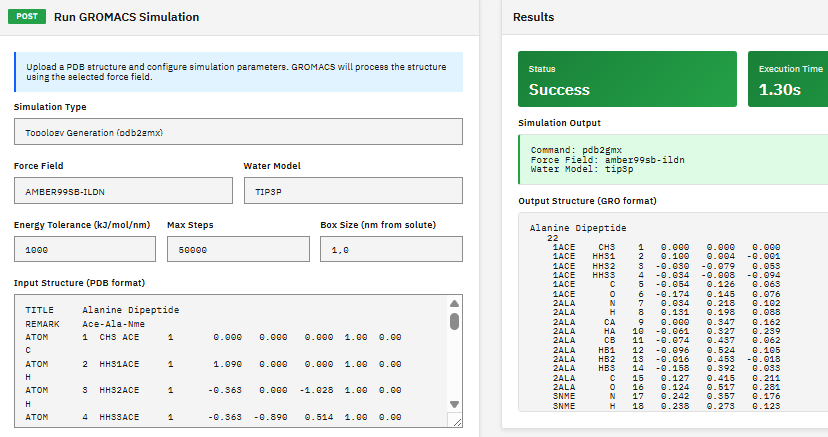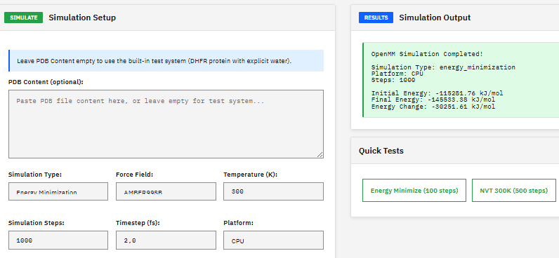 A molecular dynamics toolkit for simulating biomolecules, providing energy minimization, NVT/NPT ensemble sampling, and support for AMBER and CHARMM force fields with GPU-accelerated calculations via CUDA and OpenCL.
