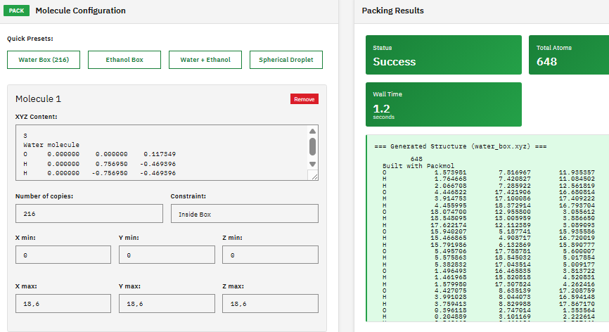 Martinez, L. et al. PACKMOL: A package for building initial configurations for molecular dynamics simulations. J. Comput. Chem. 30, 2157-2164 (2009). DOI:10.1002/jcc.21224