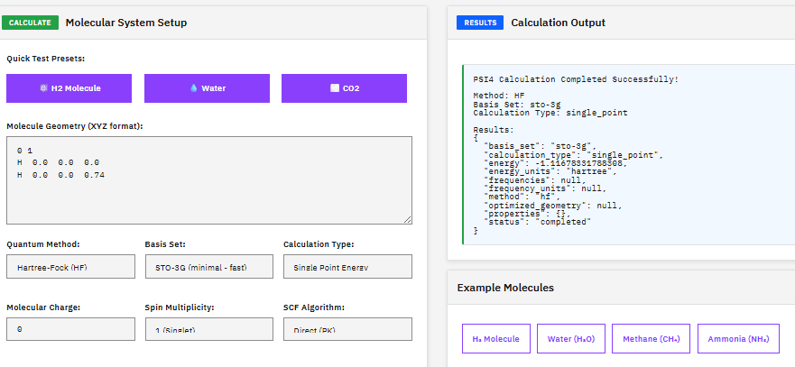 A quantum chemistry suite providing Hartree-Fock, DFT, MP2, coupled cluster, and symmetry-adapted perturbation theory (SAPT) methods for high-throughput electronic structure calculations.