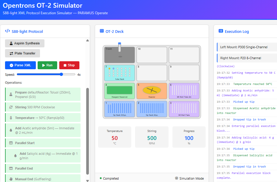PARAMUS Operate, the robotic orchestration platform, is designed for modern chemistry research. Our system seamlessly integrates robotic liquid handlers, analytical instruments, and data acquisition systems through a unified JSON-RPC API, enabling fully automated experimental campaigns with complete traceability.