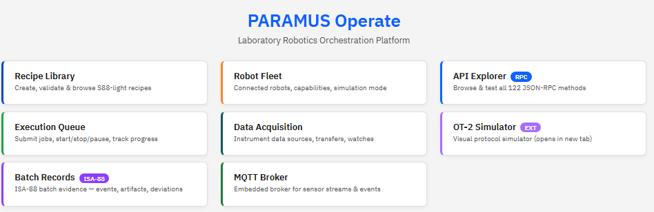 The clean, icon-free interface prioritizes clarity and efficiency, with 123 API methods providing complete programmatic control over recipes, queues, batches, data sources, and connected instruments. Native support for Opentrons OT-2 liquid handlers, MQTT-based sensor streams, and extensible connector architecture means PARAMUS Operate grows with your laboratory – from single-robot benchtop setups to fully integrated automation platforms.